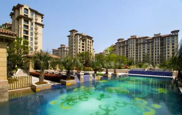地中海高層公寓系列交通組織實行組團人車分流,車行布置于外圍,或者直接從主入口進入地下車庫;組團內(nèi)為步行系統(tǒng),僅設(shè)置消防車道。活動休閑場地沿綠化帶散布其中,營造富有活力的社區(qū)核心公共空間。會所的室外泳池和庭院景觀,結(jié)合小區(qū)中心公共綠地設(shè)計,將人的活動融于其中。